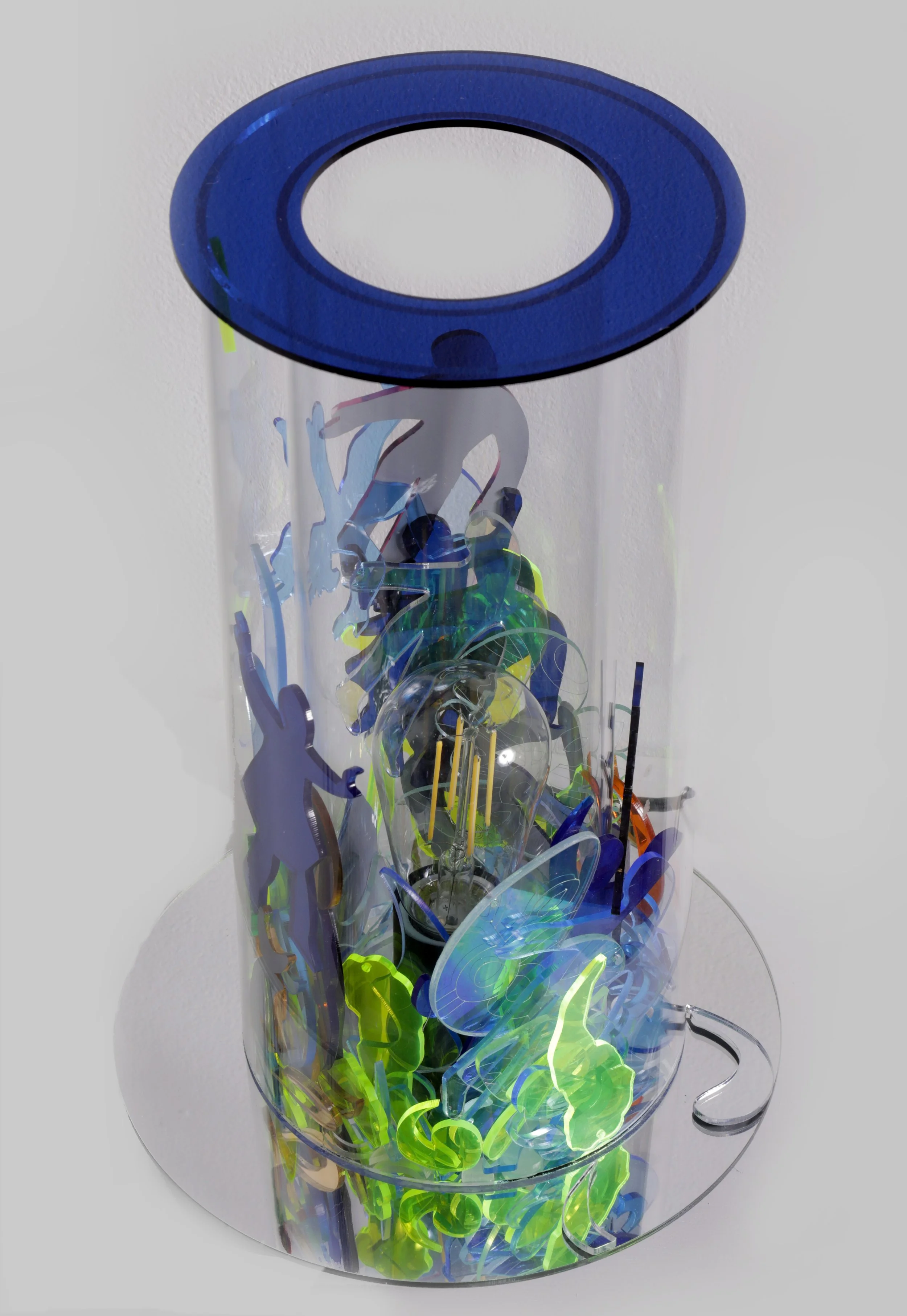 Plexiglass Art inside a 13” tall tube filled with loose pieces of shapes and figures with a LED Edison Bulb to light up a room.