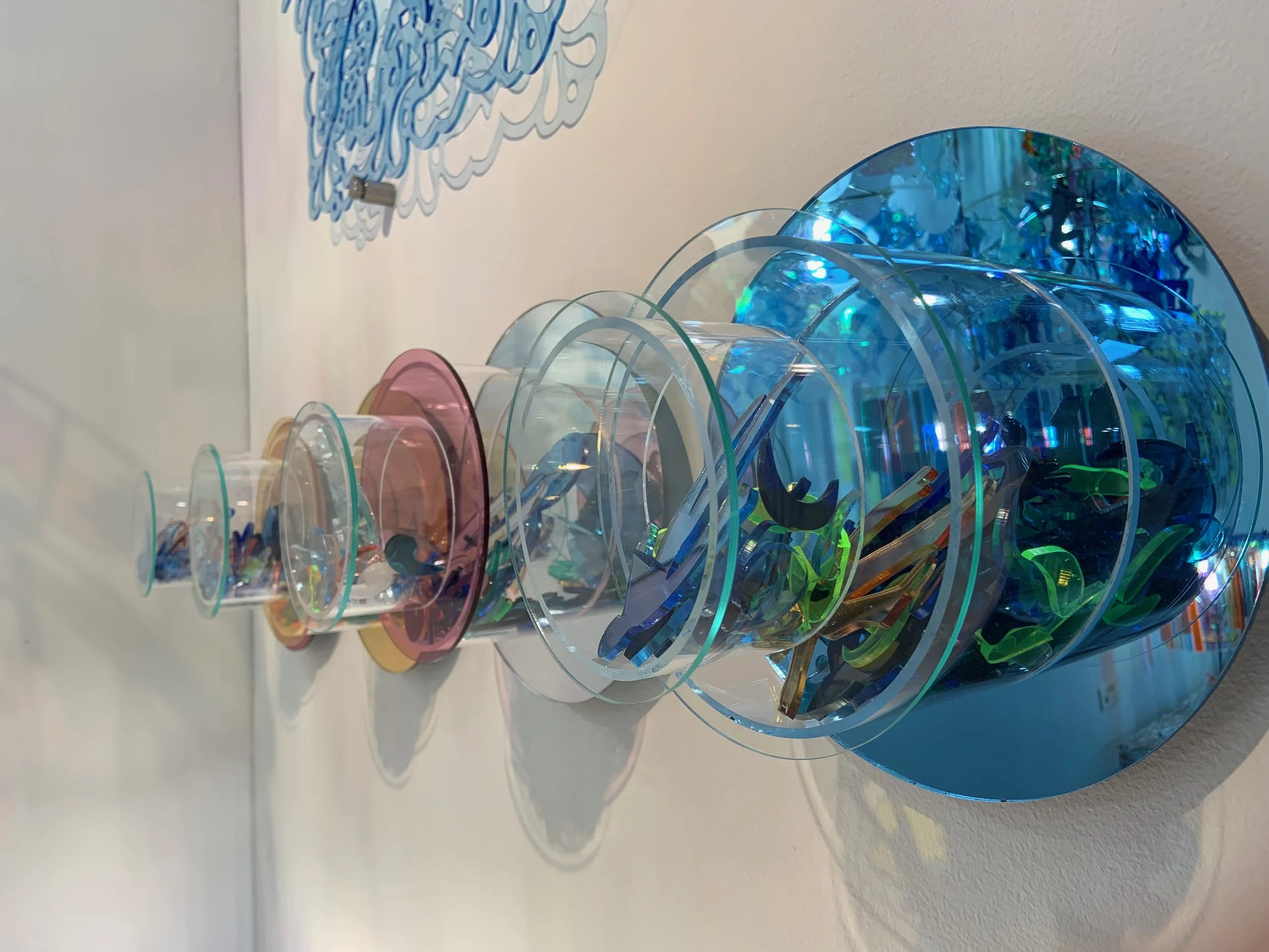 2 levels of plexiglass with clear tubes in different diameters and heights filled with loose shapes and dancers reflected in the tinted lids and mirrored bottoms.