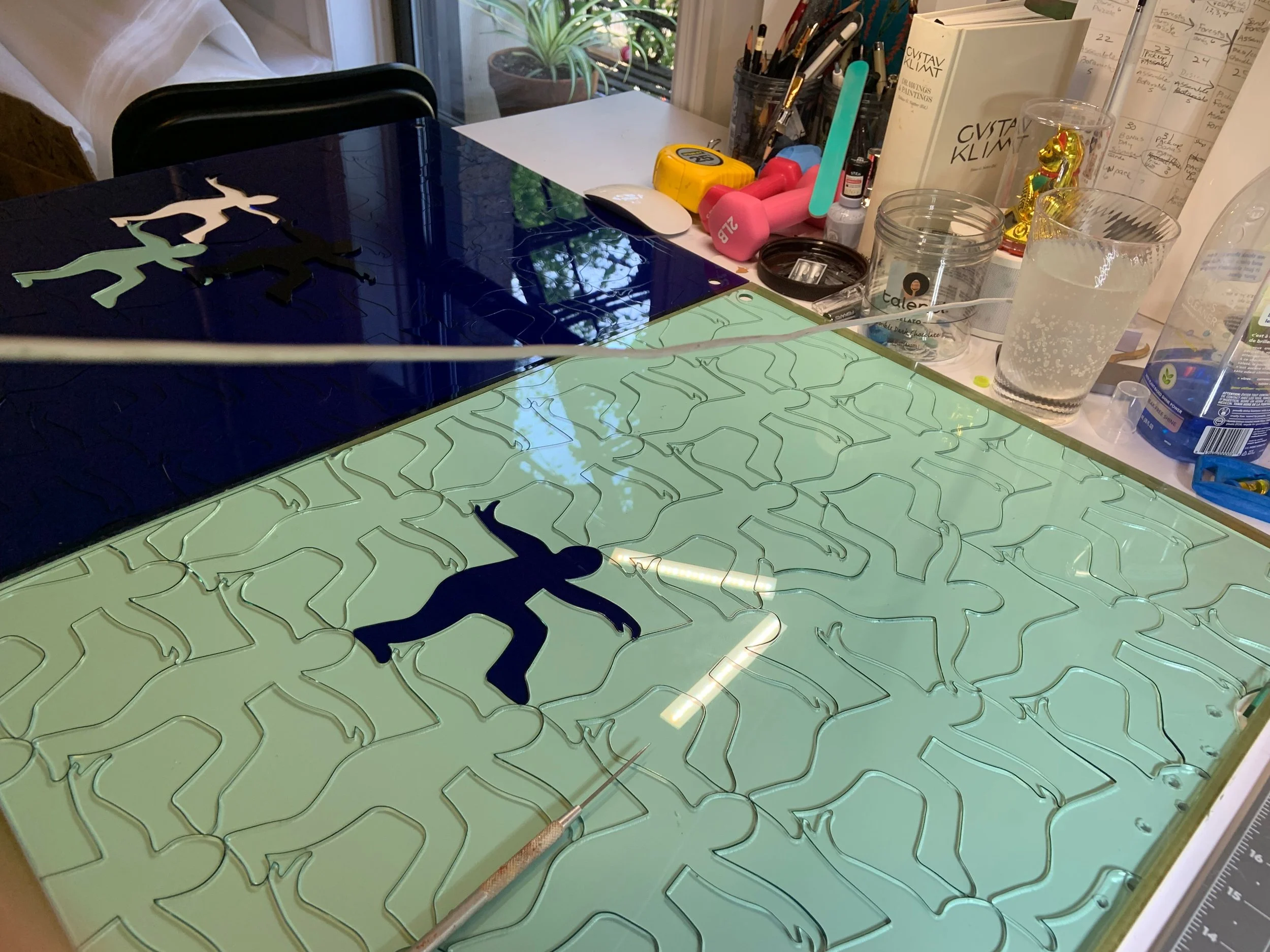 Plexiglass Art series of multicolored puzzles with a design that shows a pattern of figures moving in one direction except for one because that’s reality. There’s always one that isn’t in step. These puzzles are mounted on 2” standoffs and cast muted shadows from the light passing through the plexiglass.